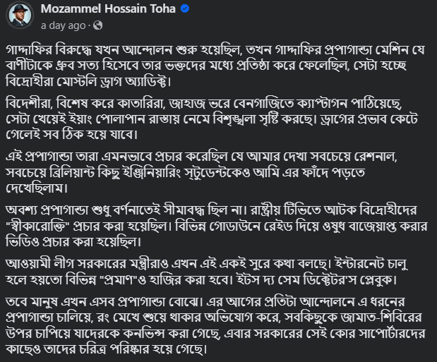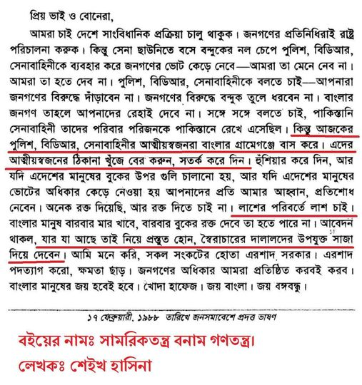আর বিএনপি, আপনারা বসে বসে লেওড়া চুষেন। আপনাদের চেনা হয়ে গেছে, হাজারটা ছেলেমেয়ে মারা গেলো আর আপনারা গ্রেপ্তার হওয়ার ভয়ে বসে বসে মুড়ি খেয়েছেন। রাজনৈতিক শুয়োরদেরকে প্রতিহত করার জন্যে আপনাদের আসা উচিত ছিলো, আর কতো গণবিচ্ছিন্ন হবেন ? এইভাবে গণবিচ্ছিন্ন হয়ে থেকে গদির স্বপ্ন দেখা বাদ দেন। তরুণ প্রজন্ম যেমন এই আওয়ামীলীগকে ছুড়ে ফেলে দিয়েছে তেমনি আপনাদেরকেও ছুড়ে ফেলা হয়ে যাবে, এখনো সময় আছে রাজনৈতিক বুদ্ধিটা খুলেন।