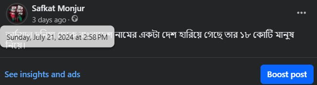 আমি নিজেকে অনেক স্ট্রং মানুষ ভাবতাম, নিজের মাথা ফেটে রক্তে মাখামাখি হয়ে যখন রাস্তায় পরে ছিলাম তখনও নিজেকে এতোটা অসহায় লাগে নি, মানসিকভাবে দুর্বল লাগে নি। কিন্তু আমি আর পারছি না। দেশে ইন্টারনেট আসার পর থেকে যেসব ভিডিও দেখলাম, যেসব ব্রুটালিটি দেখতে হলো, আমার এই ট্রমা থেকে বের হতে কতোটুকু সময় লাগবে আমি জানি না।