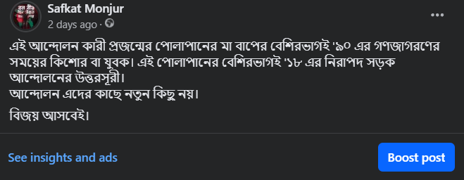 সবশেষে ‘আই হেট পলিটিক্স’ মার্কা পোলাপান, মাইর খাওয়ার পরে বুঝতেছো তো এখন কেনো পলিটিক্স করা দরকার ? রাজনীতির প্রত্যক্ষ অভিজ্ঞতা থাকলে এইভাবে মাইর খাইতে হতো না, ময়দানের পরিস্থিতি বুঝে আন্দোলন করতে পারলে হতাহতের সংখ্যা আরো কম হতে পারতো। প্রতিটা সংঘর্ষ, ধাওয়া পালটা ধাওয়া এর একটা রিদম আছে, যেটা ময়দানে রাজনীতি না করলে ধরা সম্ভব হবে না। যে পরিমাণ হিংস্রতা নিয়ে ছাত্রলীগ, যুবলীগ হামলা করেছে সেই হিংস্রতার প্রতিদানে এর সিকিভাগও দেখাতে পারলে এরা গায়েব হয়ে যেতো।