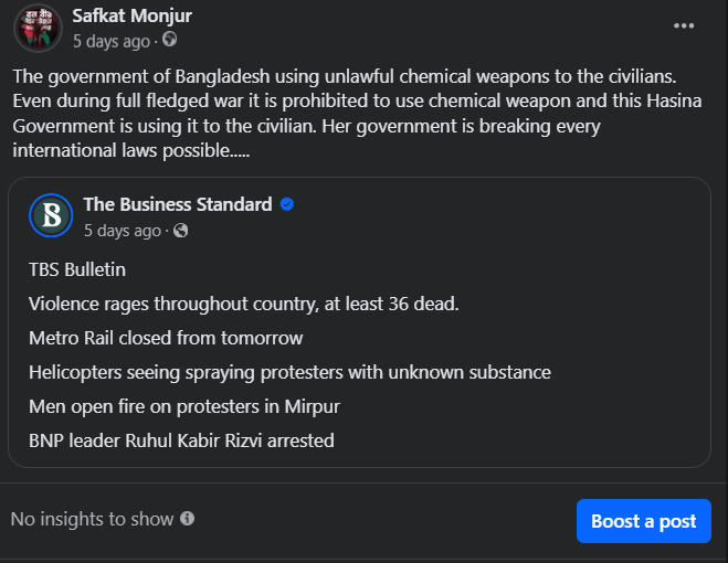 একটা ভিডিওতে দেখলাম যে পরিমাণ হিংস্রতার সাথে পুলিশ বৃষ্টির মতো গুলি করতেছিলো, ব্যক্তিগত রোষানল ছাড়া শুধুমাত্র পেশাগত কারণে এইভাবে মারা সম্ভব না। আমার সিরিয়ান বান্ধবী যার সরাসরি যুদ্ধের ময়দানের অভিজ্ঞতা আছে, যে ট্রমার কারণে সে এখনো থেরাপি নিচ্ছে, সেই মেয়ে পর্যন্ত ভয়ে কেঁপে উঠেছে, এইভাবে যুদ্ধের ময়দানেও নির্বিচারে গুলি চলে না।